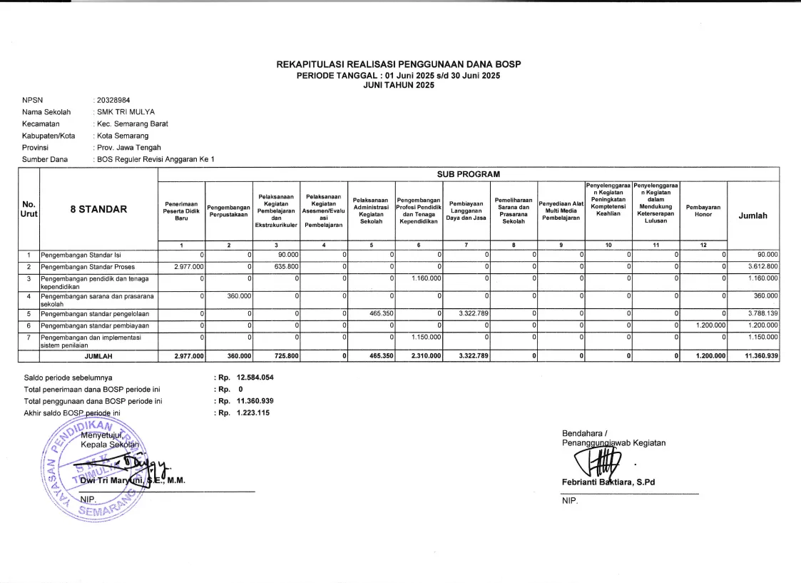 Rekapitulasi Realisasi Penggunaan Dana BOS Reguler Tahap 1 (Periode Januari-Juni Tahun 2025)